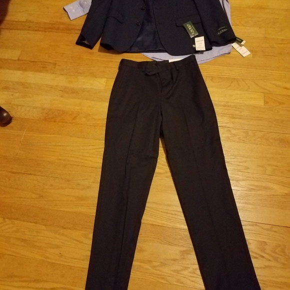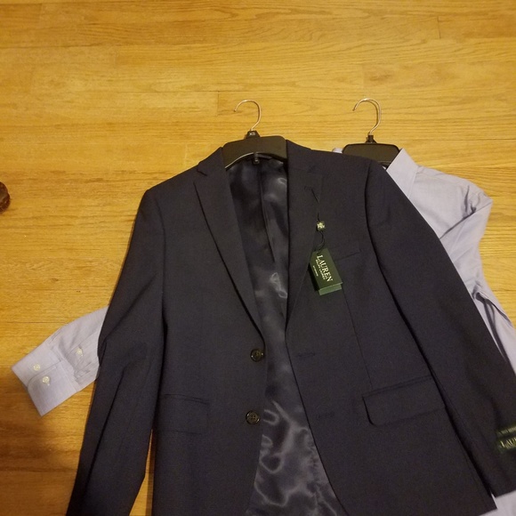Jacket is a blazer with a very light design (Navy blue) Pant (Navy blue) Light Blue button up shirt light blue. All pieces are Ralph Lauren