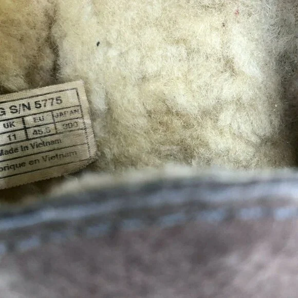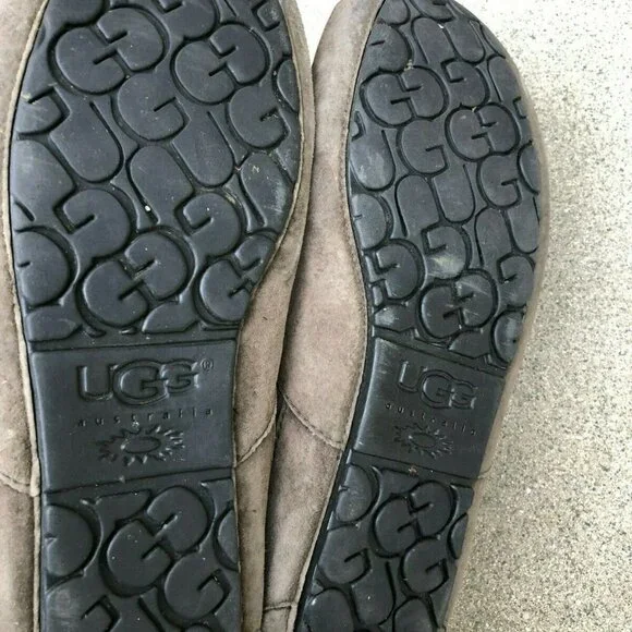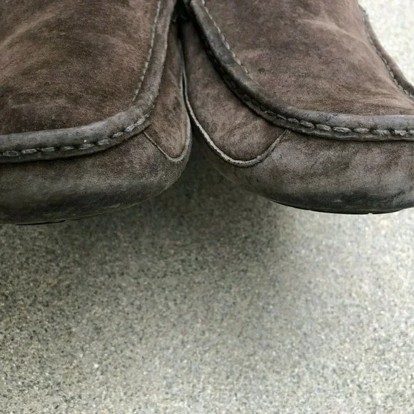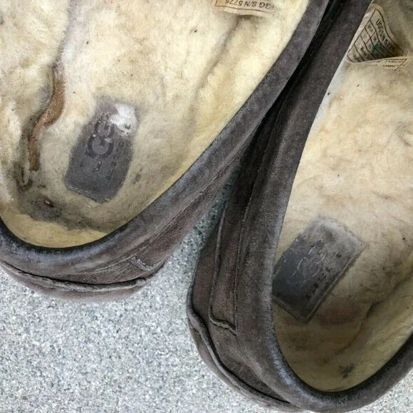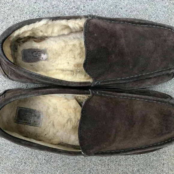 UGG AUSTRALIA Mens 12 Ascot Brown Sheepskin Sherpa Moccasins Slippers Shoes 5775Size: Men´s Size 12Color: BrownDetails:Gently Pre-owned. Genuine Leather Suede. The sherpa on the inside is matted from wear. Please take a look at the pictures for exact condition.
