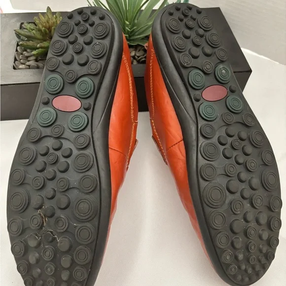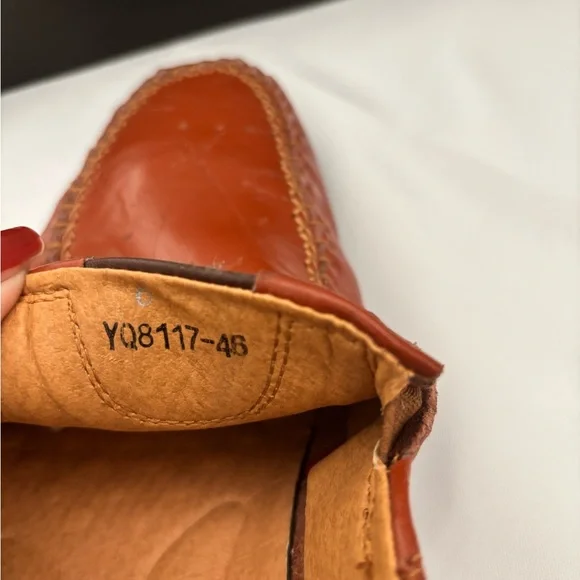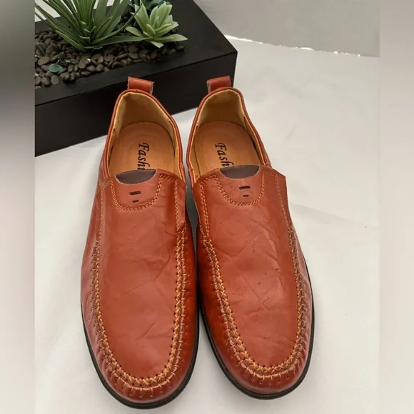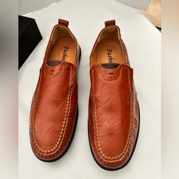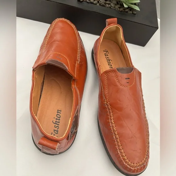 Soft Italian leather moccasins. The softest and most comfy pair of shoes you can buy. Very masculine and sexy look.These shoes have thick rubber traction soles.The memory foam inner soles are made to last.If your taste is trendy, masculine comfort, classic, and modern these would be for you. The metal “ sport” emblem on the sides add a touch of style to the shoes.Can be an addition to dressy or casual look.Preowned excellent condition. No stains, tears on leather. See photosClean nonsmoking home