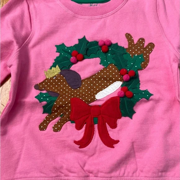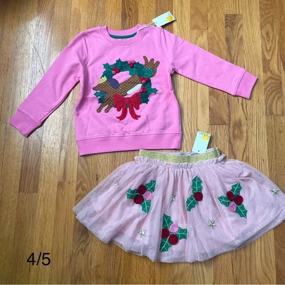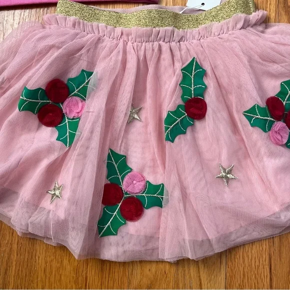 NWT mini Boden Holiday skirt with holly appliqué and appliqué crew neck pullover. Size 4/5