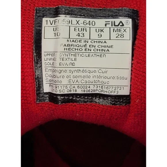 Fila F-13*Men´s size 10*1VF059LX-640*Red, navy, and white*High top athletic shoes*Ankle strap and lace up closure*Leather*Cleaned and sanitized*Pre-owned, very good condition, gently worn*Please see all photos for details and condition