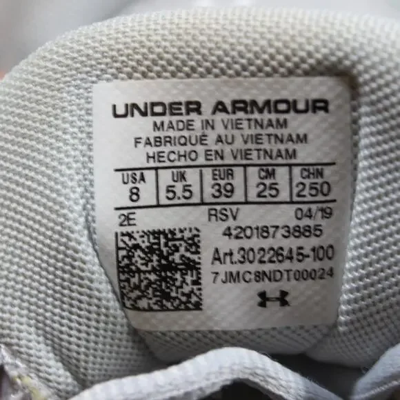 Built for performance and comfort, these Under Armour Charged Assert 8 running shoes feature a breathable mesh upper, durable leather overlays for stability, and Charged Cushioning® midsole for ultimate responsiveness. This pair comes in a versatile light gray with vibrant orange accents and is designed in a men’s 2E wide fit for extra comfort.Brand: Under ArmourStyle: Charged Assert 8 (3022645-100)Size: Men’s 8 (2E Wide)Color: Light Gray / Orange / WhiteMaterial: Mesh upper, rubber soleClosure: Lace-upCushioning: Charged Cushioning® midsoleOutsole: Durable rubber with traction zonesCondition: Excellent pre-owned condition. Light wear on soles. Clean uppers. See photos.Measurements (Approximate):Insole length: 10.25"Outsole length: 11.5"Outsole width at widest: 4.5"Notes: Color may vary slightly due to lighting. Please review all photos for condition and details.