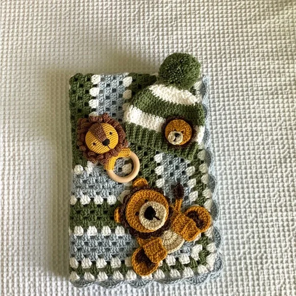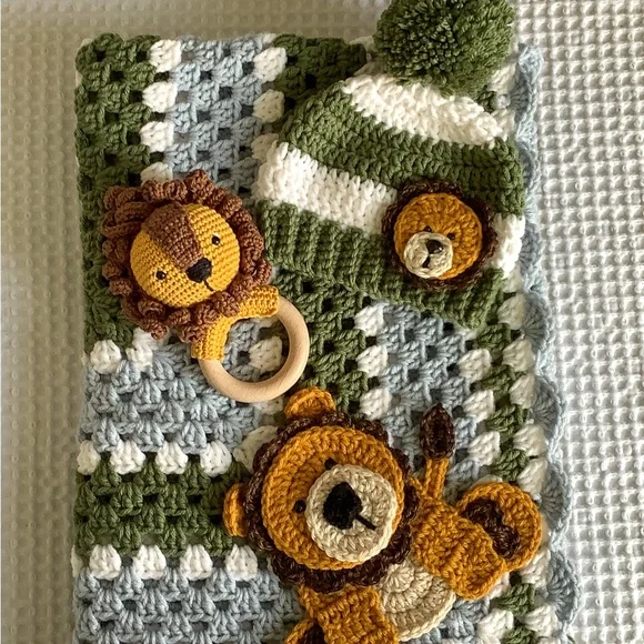 This set is handmade by myself! Blanket measures 30x30. Colored baby blue, white and green. A lion appliqué is attached to the blanket. Super cute. Made using soft acrylic yarn.Newborn hat with a lion appliqué on it. Made using soft acrylic yarn. Sized 0-3 months so it’ll fit for awhile. Last a lion rattle teething ring. Made using a birch teething ring and cotton yarn. Finishes off this adorable set! Washing instructions will come with this set! If you are looking for a custom set just let me know.