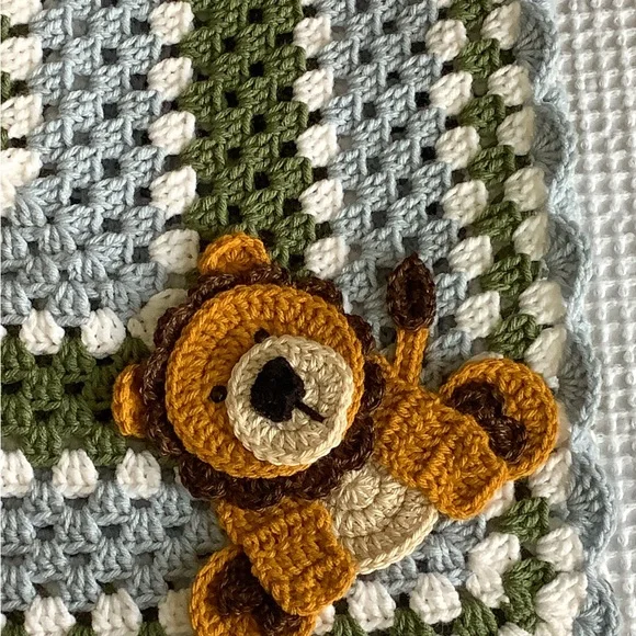 This set is handmade by myself! Blanket measures 30x30. Colored baby blue, white and green. A lion appliqué is attached to the blanket. Super cute. Made using soft acrylic...