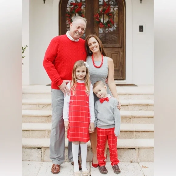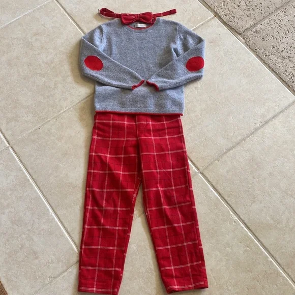 Bella bliss grey with red elbow patch cashmere sweater size 5Bella bliss red plaid pants size 5 (elastic waist) Bella bliss bow tie (adjustable)White ralph Lauren polo is listed separately (size 4) I also have the girls size 8 dress listed separately