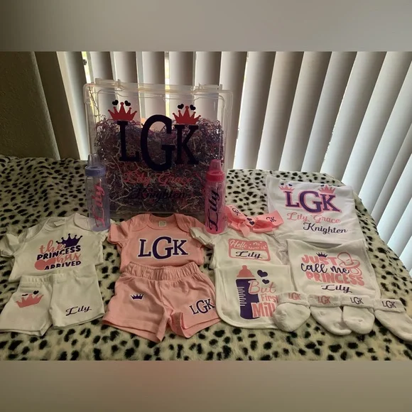 Personalized Medium Baby Girl Bundle3 onesies2 pair of pants or shorts2 pair of socks2 bibs1 bottle1 pacifier clip1 baby blanket1Clear baby boxGet your own customized bundle boxThey make great baby shower gifts