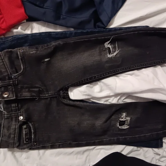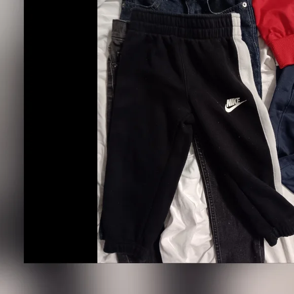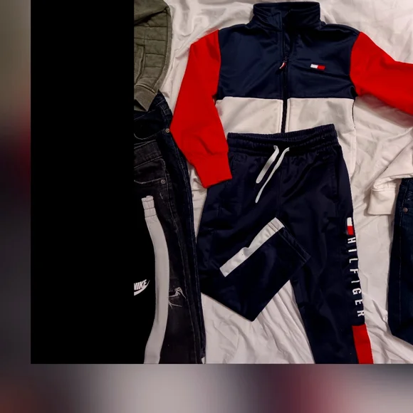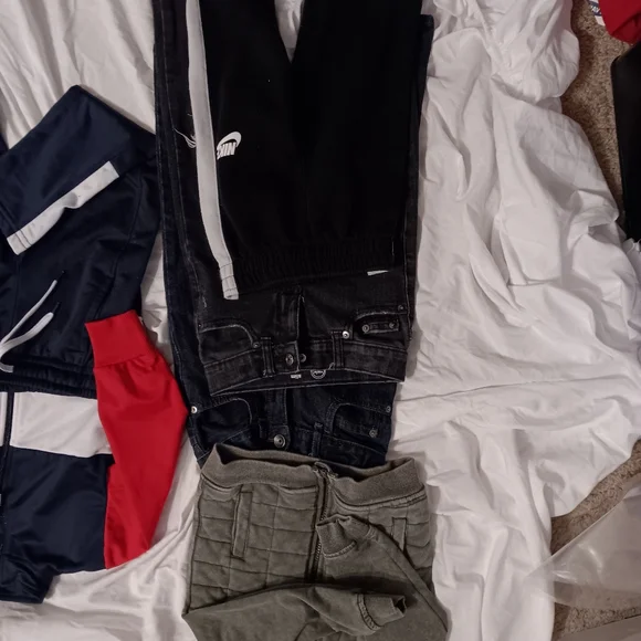 1 hoodie with pants to match/1 tracksuit top & bottom/1 pair children´s place dark blue denim jeans/ I pair black distressed denim jeans/1 pair Nike sweats/one camo green...