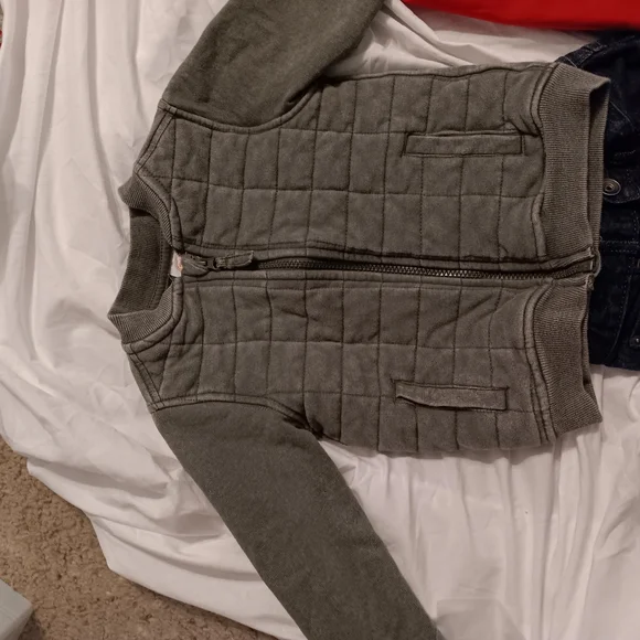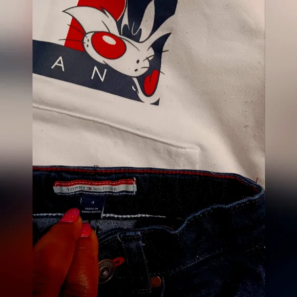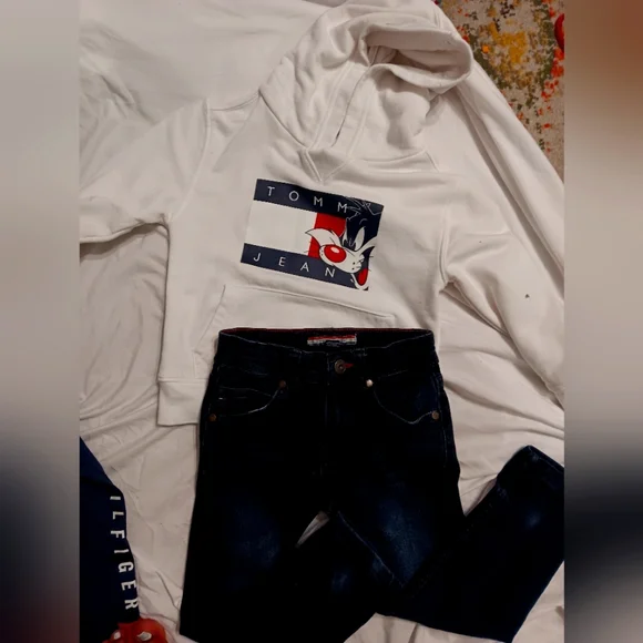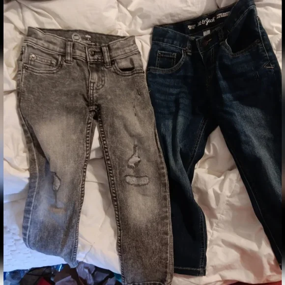1 hoodie with pants to match/1 tracksuit top & bottom/1 pair children´s place dark blue denim jeans/ I pair black distressed denim jeans/1 pair Nike sweats/one camo green boys zip up sweater. All items in really good condition and all items size 4. FYI, that is a cotton ball on the sleeve of the white hoodie, it´s not dirt, I just didn´t realize it was on there until I posted the pic and was too lazy to take another, sorry. All the items were only worn a couple of times. All sales are final, thanks. Oh, just added 3 more pairs of jeans(last 2 photo) price is firm.