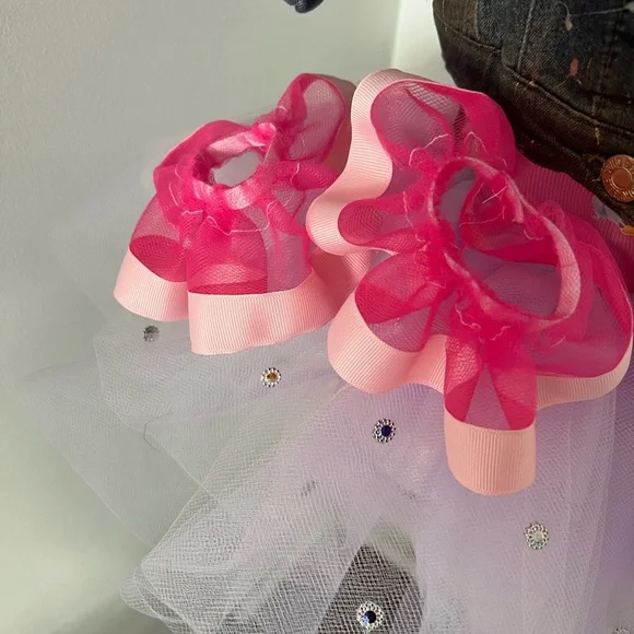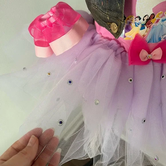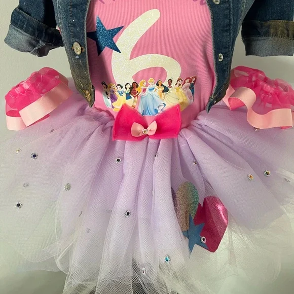 Do you have a little one dreaming to be a princess? I’m Caroline and I would love help you create a memorable birthday outfit for your little one! I can do any character or color scheme! This creation includes the tutu, top, denim jacket, headband and the cutest little matching foot ruffles. Turn around time is 2-3 weeks.
