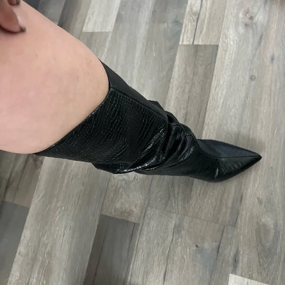 Bought these boots, but didn’t fit me past my calf, too late to return them. Never worn them as they don’t fit my big calf. Beautiful staple heel boots that I love.