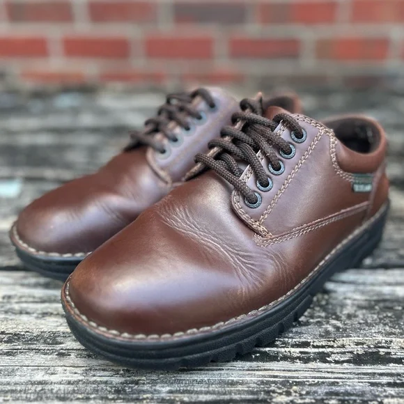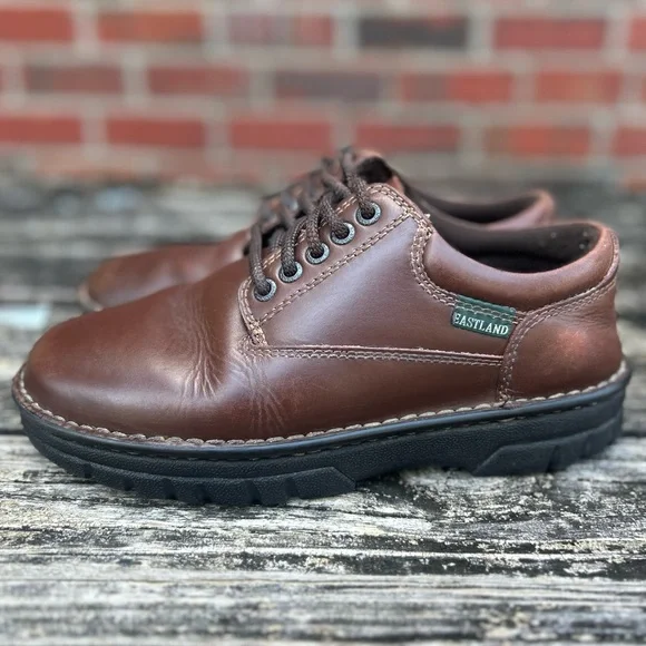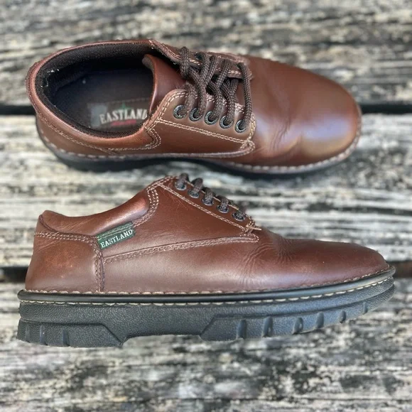 Eastland Men´s Plainview Brown Leather Lace Up Oxford Durable Rubber Sole Size 7. Experience timeless style with Eastland´s brown leather Oxfords, featuring a sleek design and sturdy construction. These shoes boast a smooth leather finish, traditional lacing, and a durable rubber sole, making them perfect for both casual and semi-formal occasions.