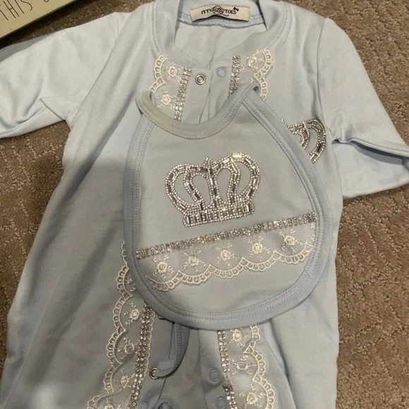 Itty bitty toes set for newborn boys. Was worn once for a photo shoot. Slight discoloration on the bib(photo attached)