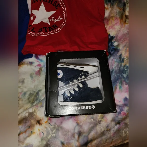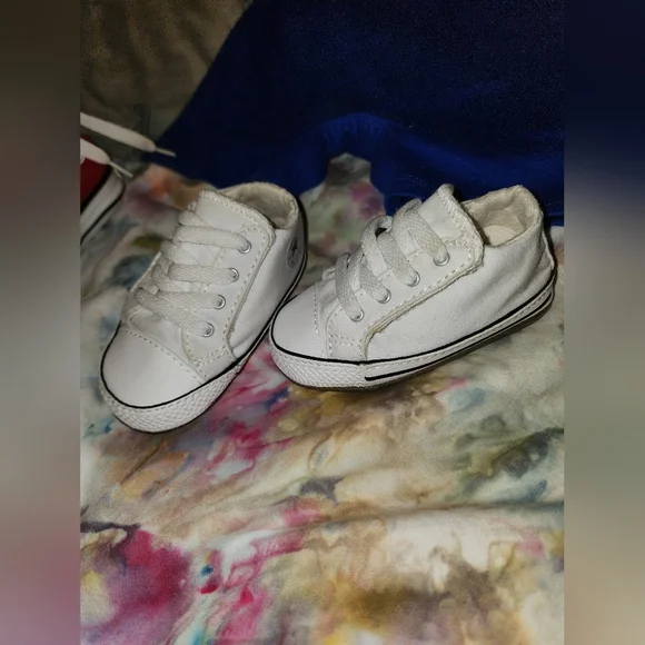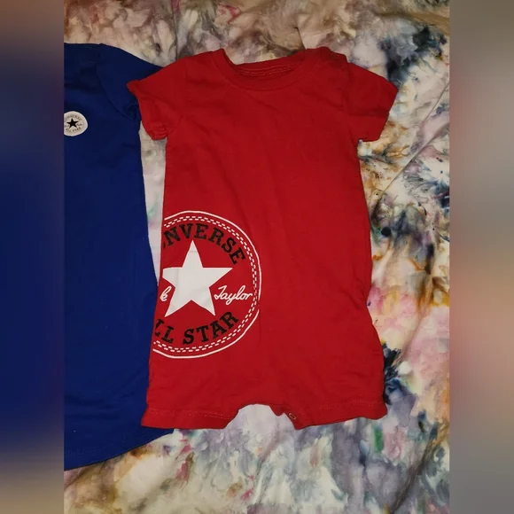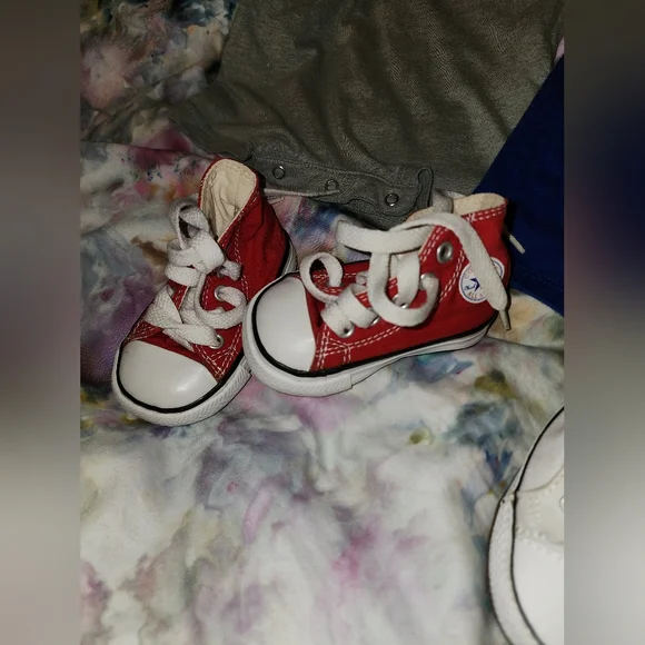 Converse bundle!3 like new rompers. All 9mth3 pairs like new converse crib shoes. Size 3cBlack, never worn. White, worn once.Red one are size 2c, but fit more like 3c, never wornBlack & white are chuck taylorsI also have a listing of converse size 2c, Multiple colors