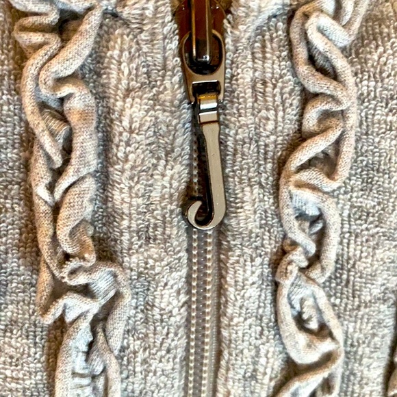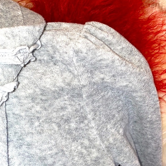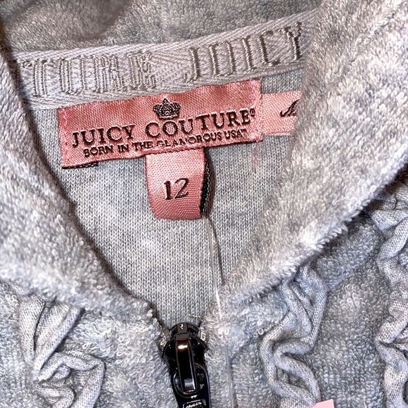 - Size: Set 12 Approx Jacket 12 32” Chest/ 21” Length/ 23” Sleeve; Pant 12 26” Adjustable Waist/ 28” Inseam/ 8” Leg Opening- Color: Heather Janey- Material: 80% Cotton/ 20% Polyester- Terry Cloth (Thicker than Classic Terry)- Adjustable Waist Drawstring- Gun Metal Logo “J” Zipper Pull Jacket w/ Ruffled Detail- Ruffled Hood Detail Jacket w/ Kangaroo Pockets- Classic Track Pant w/ Ruffled Detail Scoop Pockets- Embellished With Metallic Graphic & Print on Jacket & Pant “JUICY COUTURE”- New