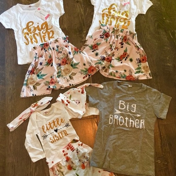 NWT 0-3 m, 3-4T, 4-5T Boutique Sibling Floral Outfits for Newborn Photo Session / Coming HomeIncluded:—A 0-3 m 4-PC “Little Sister” Floral outfit,—2, 3-4T 3-PC Matching “Big Sister” floral outfits, —A 4-5T coordinating “Big Brother” grey t-shirtNote:Check out my other photography newborn outfit bundles!