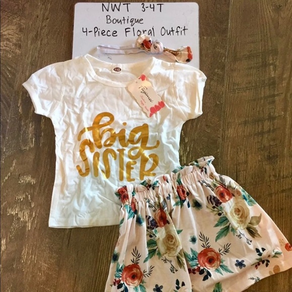 NWT 0-3 m, 3-4T, 4-5T Boutique Sibling Floral Outfits for Newborn Photo Session / Coming HomeIncluded:—A 0-3 m 4-PC “Little Sister” Floral outfit,—2, 3-4T 3-PC Matching...