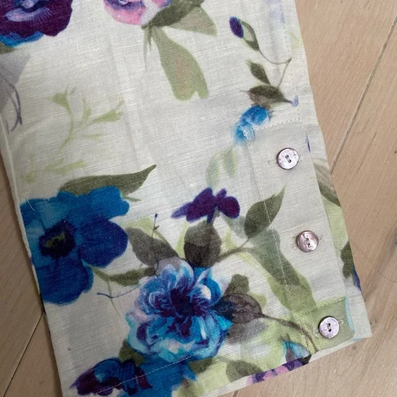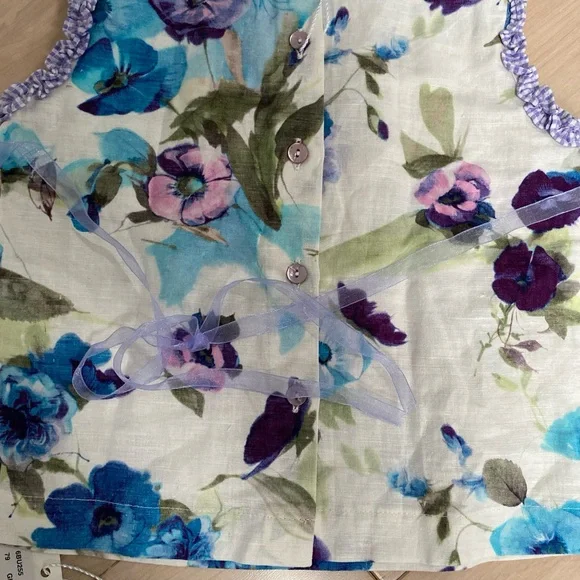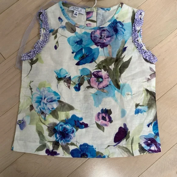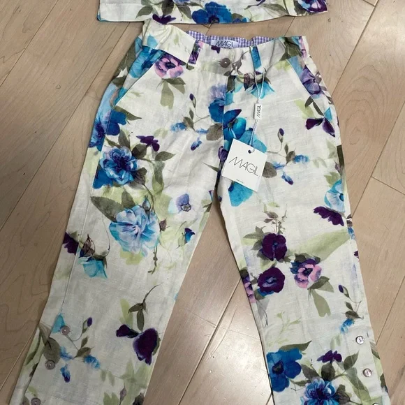 Beautiful one of a kind brand new with tags no flaws linen cotton floral top and pants set made in Italy, size 6-7 girls, adjustable waist note pants do run bit bigger so 7 -8 is more accurate.Pet & smoke free home. Ref:041824