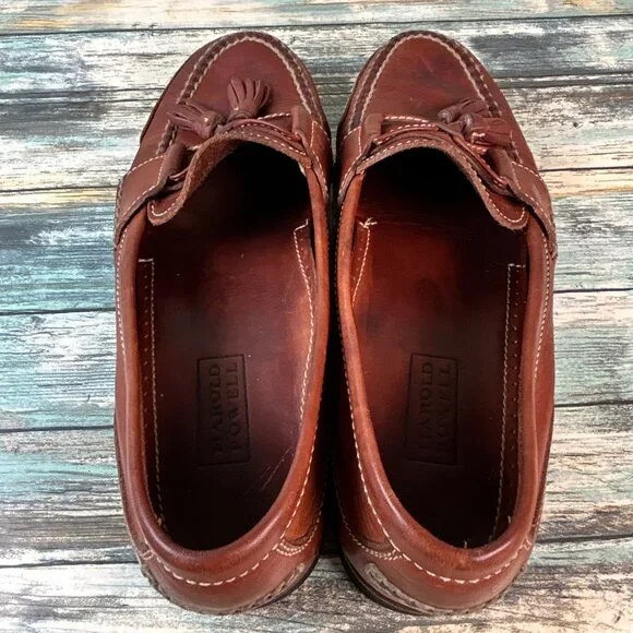Harold Powell Tassel Penny Loafer Mens 10.5M Brown Leather Moc Toe Vibram Shoes.There is some uneven wear on the heels and some small punctures on one sole ´they don´t go all the way through´ (see all photos)