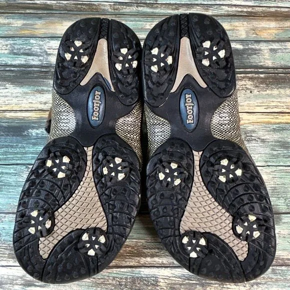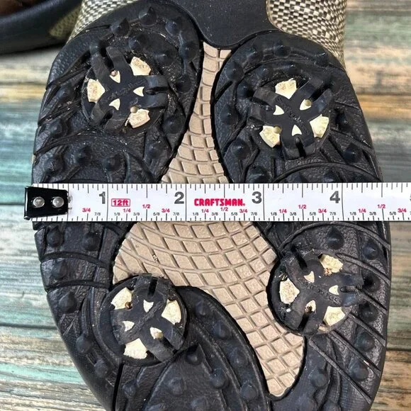 Footjoy Golf Sandals Brown Faux Leather 3 Hook & Loop Adjustable Straps Mens 8MThere is visible wear on the soles, insoles and faux leather uppers and the spikes need to be...
