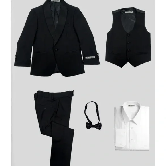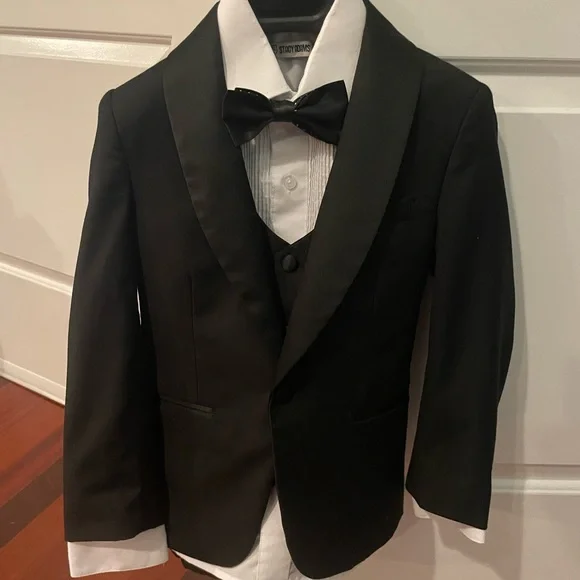 Worn once for a wedding and cleaned after. In like new condition! Lots of compliments.Boys black tuxedo 5-piece set by Stacy Adams. Slim Fit. Set includes: jacket, pants, vest, dress shirt, and bowtie.High quality boys tuxedo. Made of exceptional Poly/Rayon blend fabric (65% polyester, 35% rayon). Perfect for weddings, parties, or any other formal event. Product should be dry cleaned. Package Details:Jacket: Black two button front closure. Satin shawl lapel. Two usable front flap pockets.Vented. Interior pockets.Pants:Black slim fit single pleat pants. Elastic waistband (sizes 2-7). Larger sizes (sizes 8-20) . Tetron silk lining.Shirt: White laydown collar dress shirt . Shirt is a poly/cotton blend material.Vest: Matching black four button matching vest with fullback.Bowtie: Pre-tied bowtie that adjust around the neck. (Bow tie pattern can vary)