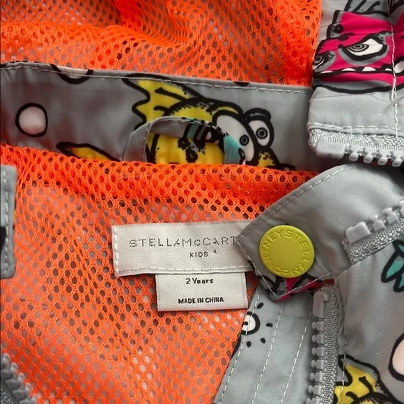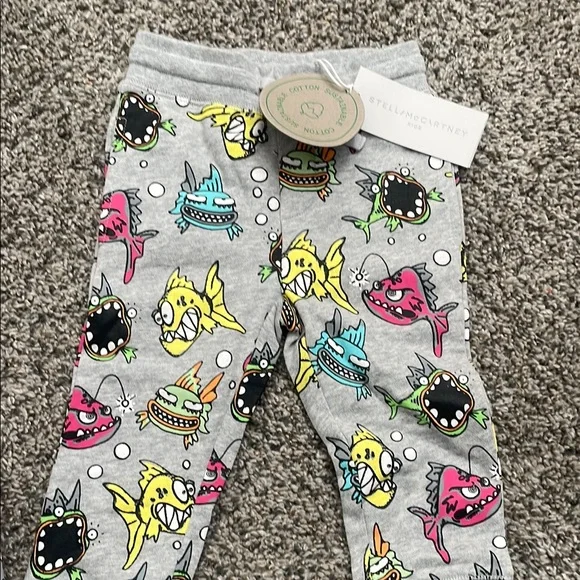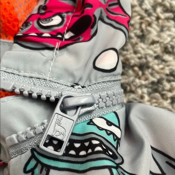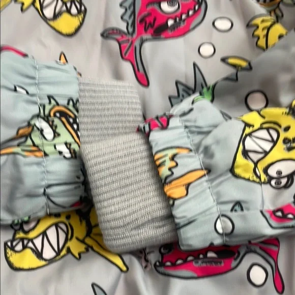 Vibrant kids hoodie and pants set with a fun shark print. Features a mix of colors including gray, yellow, pink, blue, and orange.