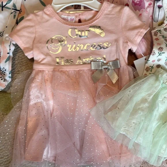 Brand New Baby girls bundle! 3 months2 Mac and Moon footies (3 months)2 Nicole Miller Footies one with a hat and 1 with a headband (3 months)1 our princess has arrived ( 0-3 months)1 Nicole miller onsie and tutu (0-3 months)1 pink tie dye Carter’s set(3 months)Beautiful collection for that beautiful baby girl!