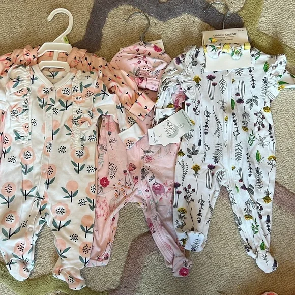 Brand New Baby girls bundle! 3 months2 Mac and Moon footies (3 months)2 Nicole Miller Footies one with a hat and 1 with a headband (3 months)1 our princess has arrived ( 0-3...