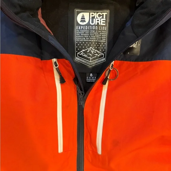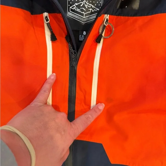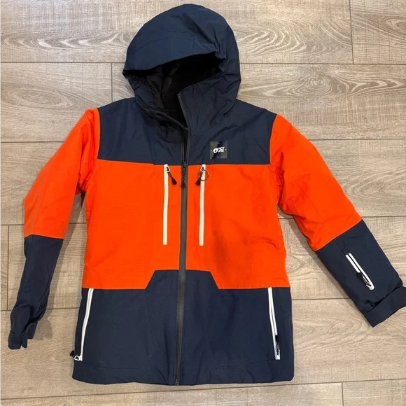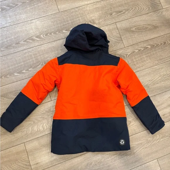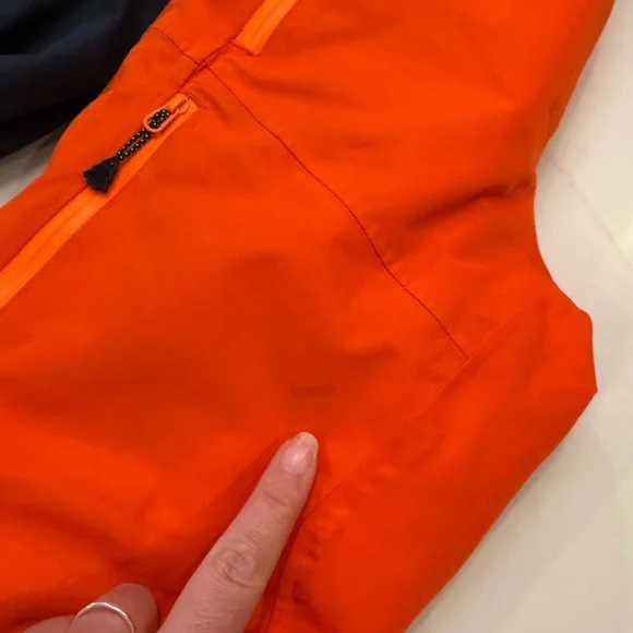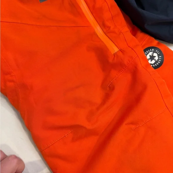 Bright orange and black design. Includes jacket and pants. Perfect for skiing and snowboarding. See photos for small marks.