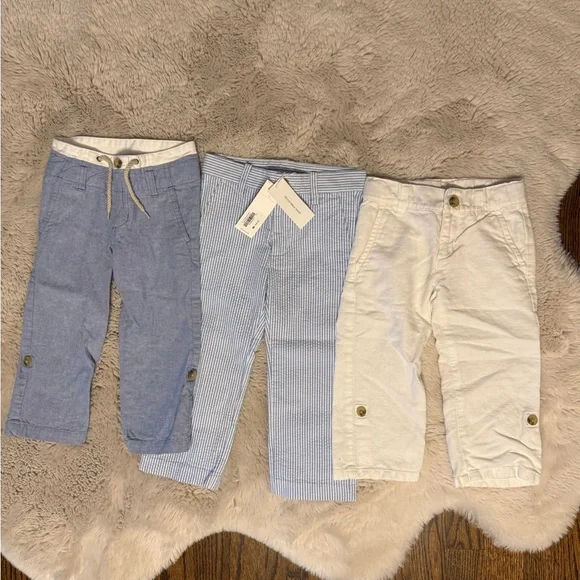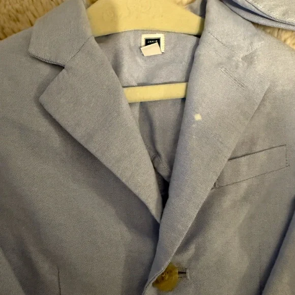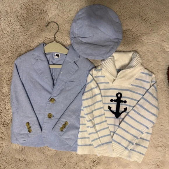Adorable toddler outfit set featuring a blue and white striped sweater with an anchor design, paired with matching pants and a light blue jacket. Perfect for a nautical-themed look.All Janie and Jack 2T light blue pants (worn once)2T white pants (worn once)2T striped seer sucker pants(NWT)2T Blazer (has small bleach spot on collar) Matching light blue newspaper boy hat2T anchor white and blue striped sweater