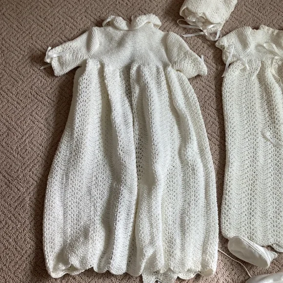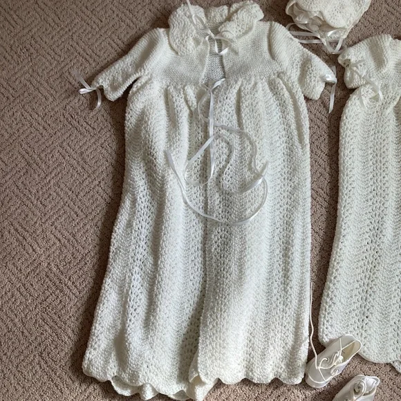 Beautiful white with silk thread coat gown and bonnet all accented with satin ribbonGown comes with slip for and satin booties A complete ROYALoutfitOne small yellow as shown