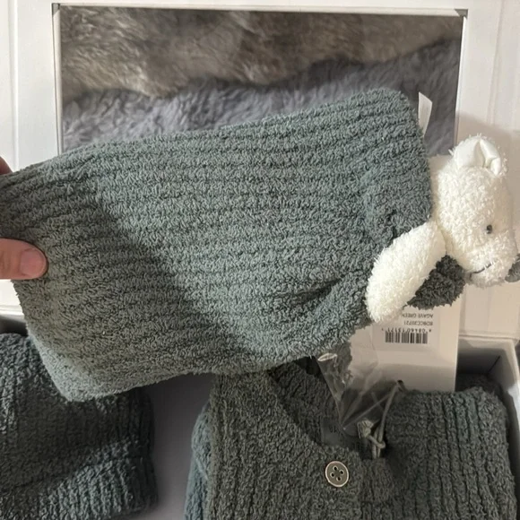 Final saleBrand new in box6-12 month 3 piece beanie toy and onesieCozy setBox shows wear from storageColor is agave green