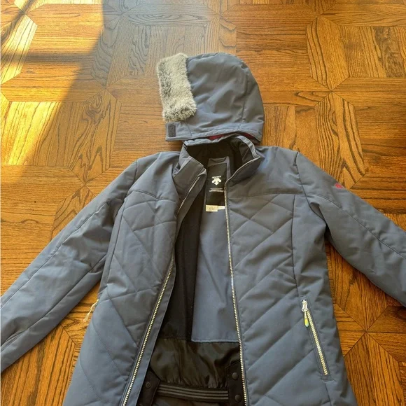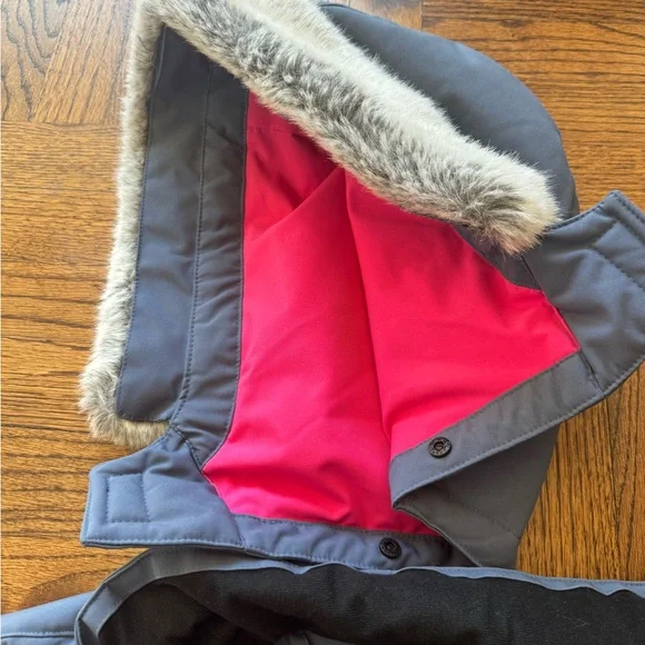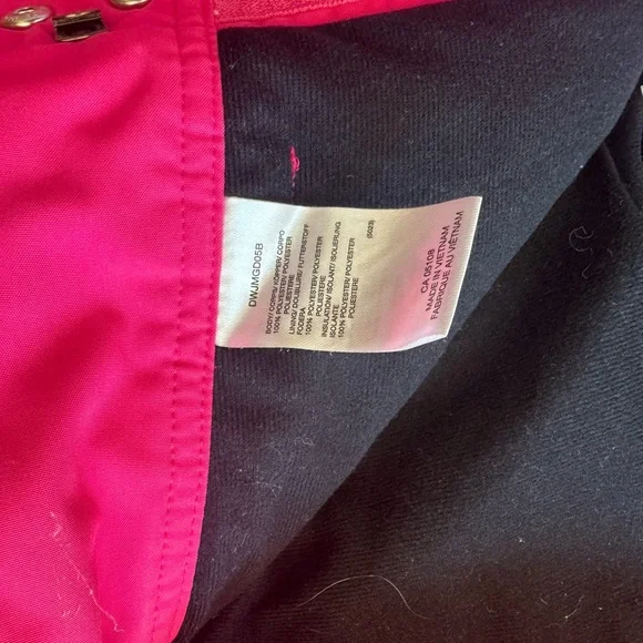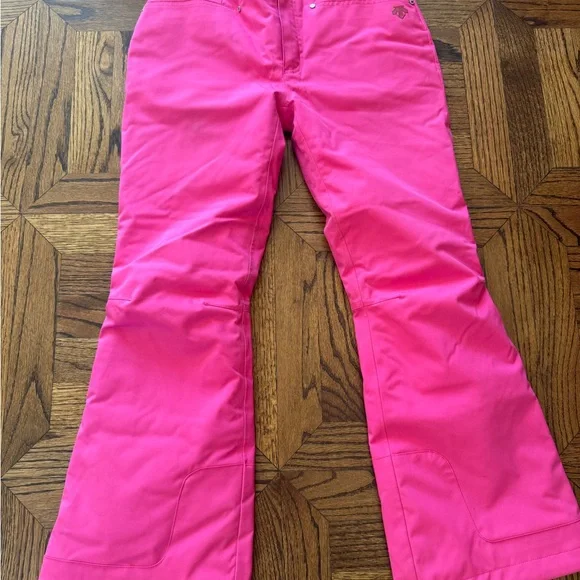 This matching set features vibrant pink ski pants designed for skiing and snowboarding winter activities. The flared style provides a comfortable fit over winter footwear while the water-resistant fabric ensures warmth and dryness in snowy conditions. Only worn 4 times.