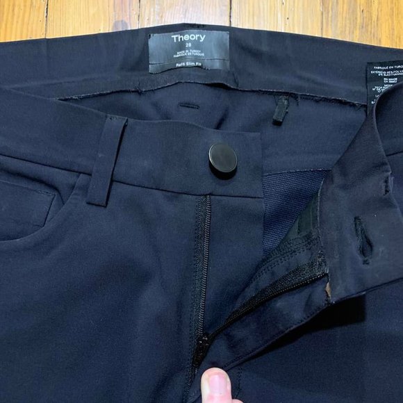 Some signs of wear with crimping around back of the knee and discoloration at belted waist.Theory´s signature five-pocket pant with a slim leg from hip to ankle. Fully bonded...