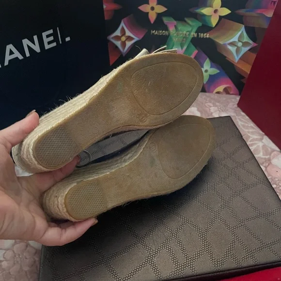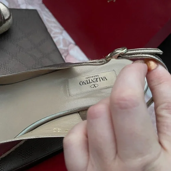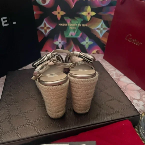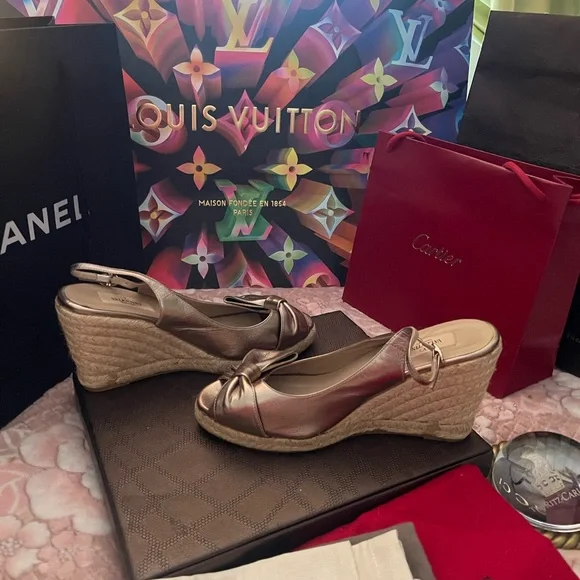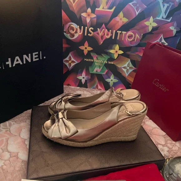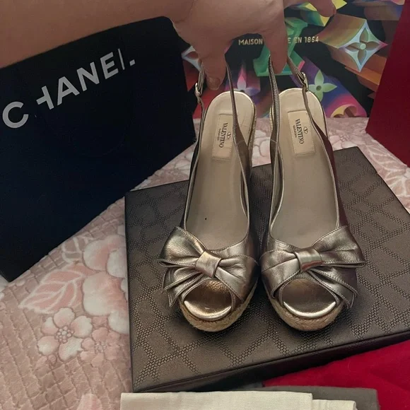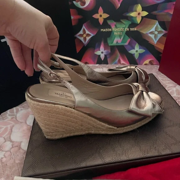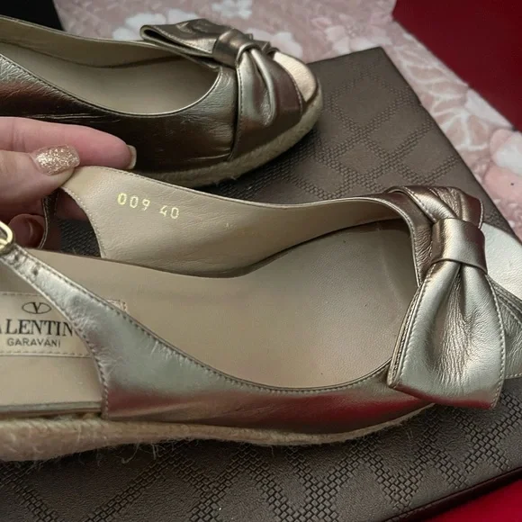 VALENTINO Gold Metallic Leather Bow Espadrille Wedges Sz 40