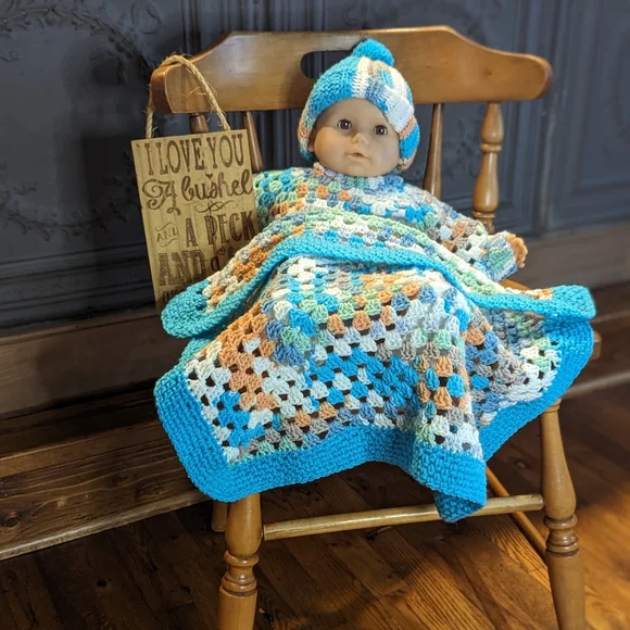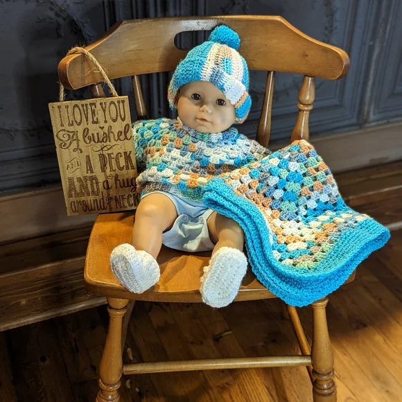 All items are handmade, never used, and prewashed-made by the seller in a smoke-free home.Set includes: (1) - Beanie (1) - Sweater (1) - Booties(1) - Car Seat size blanket (21.5in...