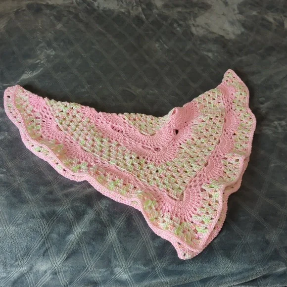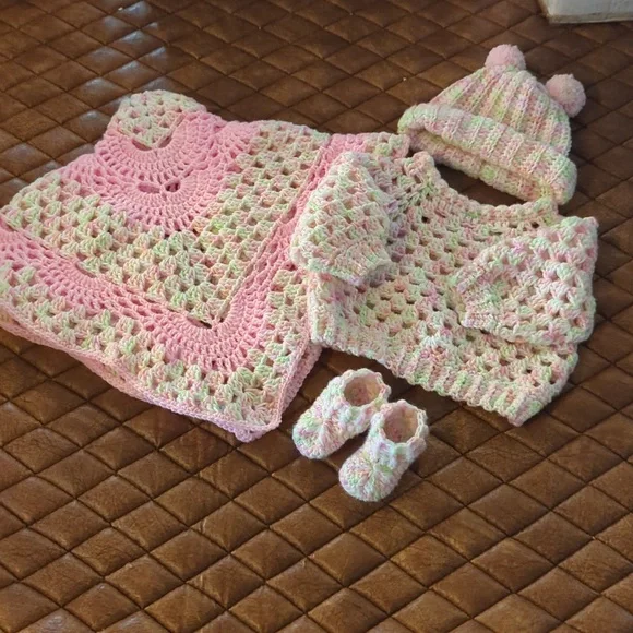 Hand crafted Crochet set for baby girl. 4 pieces include Hat with pom poms, sweater, booties and blanket. Beanie, booties and raglan sweater fits up to 3 months old. Blanket is...