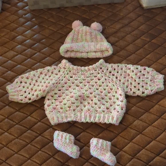 Hand crafted Crochet set for baby girl. 4 pieces include Hat with pom poms, sweater, booties and blanket. Beanie, booties and raglan sweater fits up to 3 months old. Blanket is car seat size. Made with 100% acrylic yarn handmade by the seller in a smoke free home, brand new, never used, very soft and cosy. perfect for a baby shower gift, or for a welcome home present. Baby pink yarn with a pink and green variegated yarn.