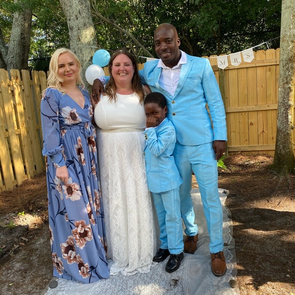 Boys Powder Blue Tuxedo / Wedding Suit in excellent condition, worn once! Custom suit, made in Jamaica. Custom measurements. Pants: 21” inseam, 12” waist. Jacket: 12” shoulder to cuff, 11.5” across the back shoulder to shoulder, 21.5” from shoulder down the back. Our son was 7 years old, 48” tall and weighed 55 pounds when he wore this for our wedding. See photos. Matching men’s suit is also available!