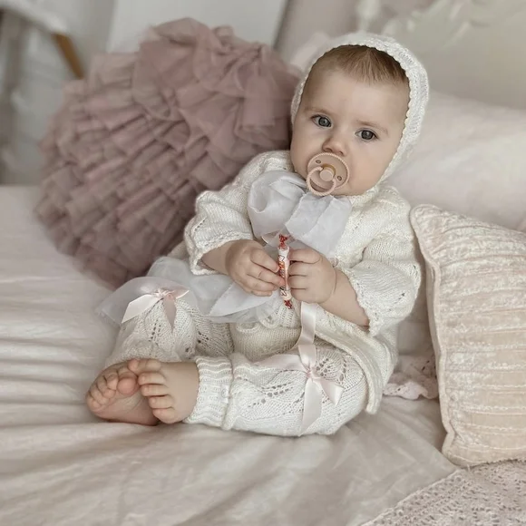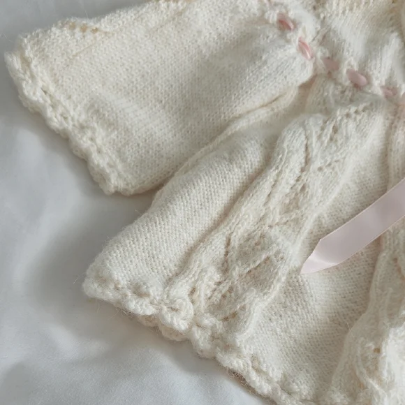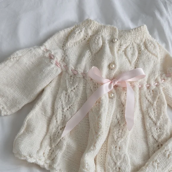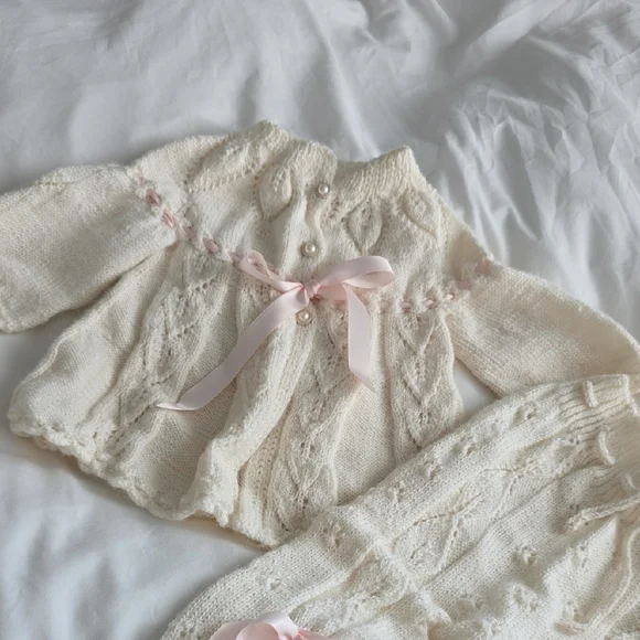 Adorableknit baby outfit featuring delicate pink bows. Includes a cozy sweater and matching pants. all handmade custom order