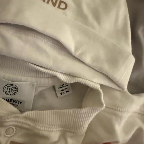 This stylish Burberry kids one piece features a classic white design with the iconic Burberry logo. Perfect for a comfortable and fashionable look.