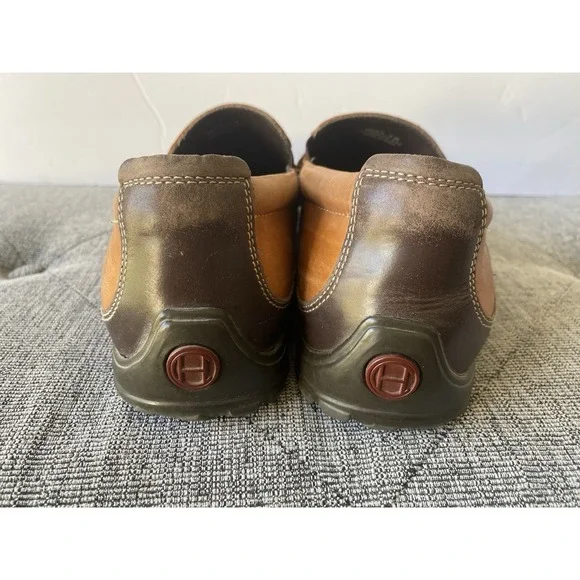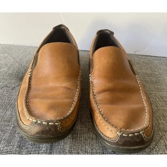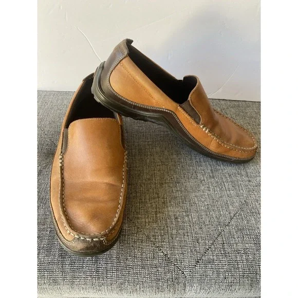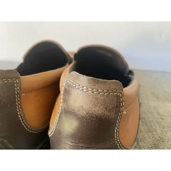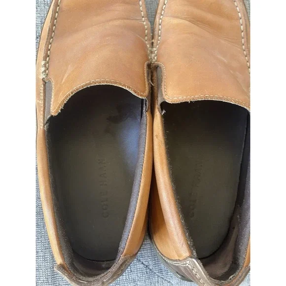 Cole Haan loafers are made of high-quality leather and feature a two tone color of tan and french roast with a slip-on design for easy on and off. The loafers are also very comfortable and perfect for all-day wear.US Size 9MUK size 8EU size 42They are in good pre-owned condition and show signs of normal wear. See photos.Retail $168