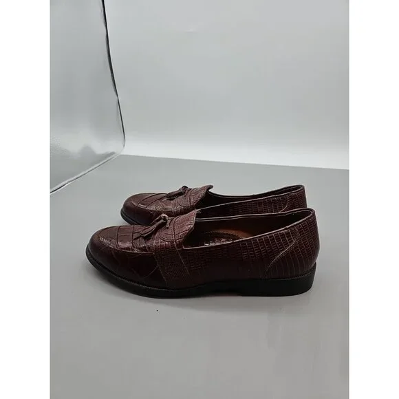 The Stacy Adams Genuine Snake and Leather Shoe in size 8M is a stylish and sophisticated dress shoe for men. Made with genuine leather and featuring a unique tassel detail, this loafer exudes a trendy and sophisticated vibe. The brown color and snake theme add a touch of flair to any outfit, making it a standout piece in any man´s wardrobe. The shoe is designed for comfort and style, perfect for the modern gentleman looking to make a statement with their footwear choice.