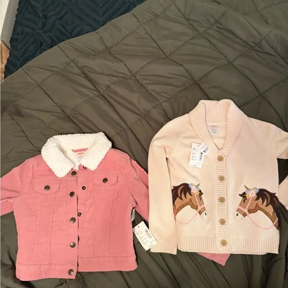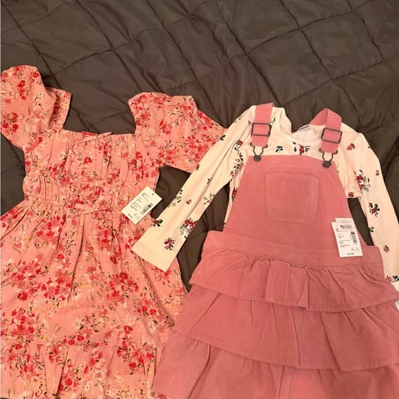 Adorable Gymboree matching sets for kids. Includes pink skirt with fringe, cream top with boots design, pink dress with horse print, and blue floral top with matching floral...