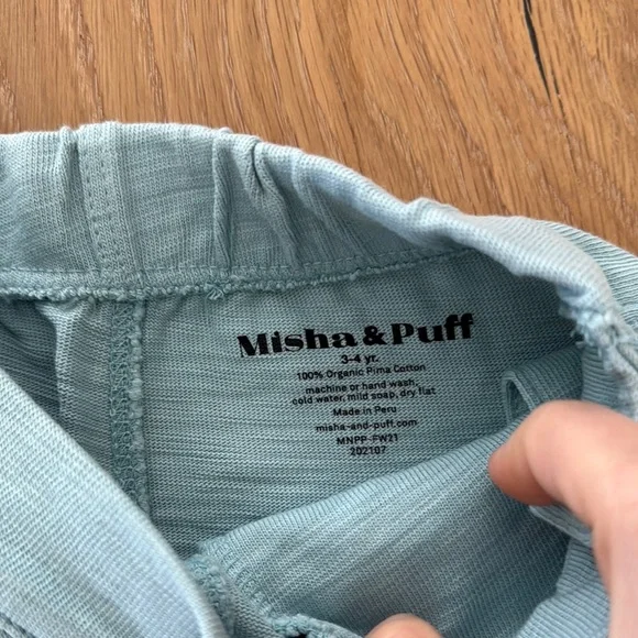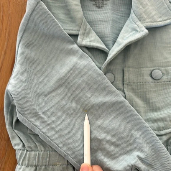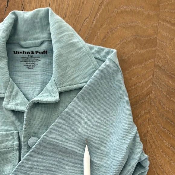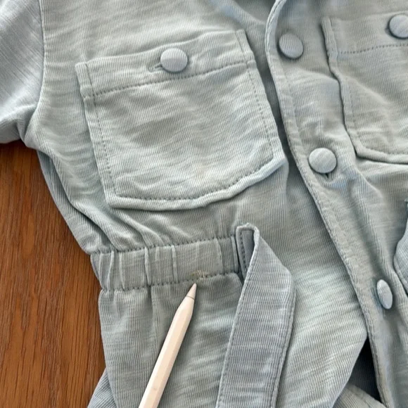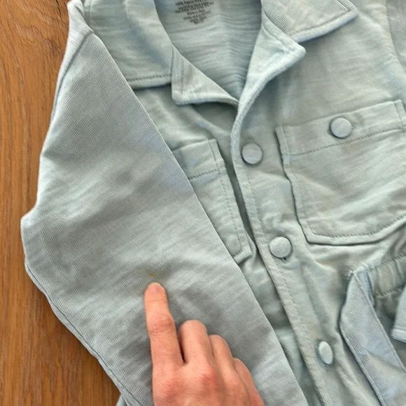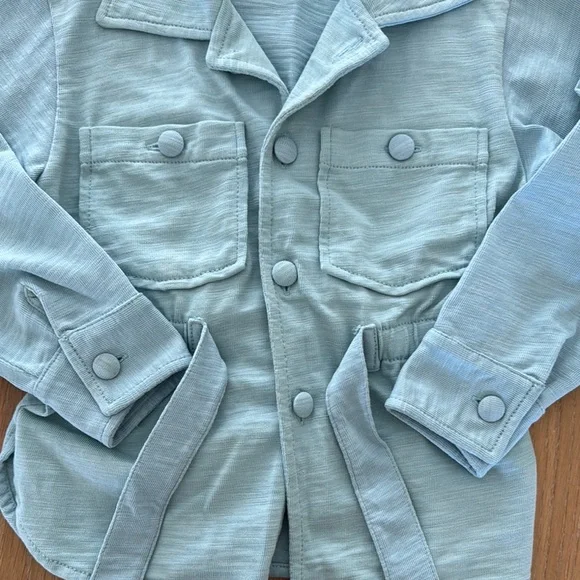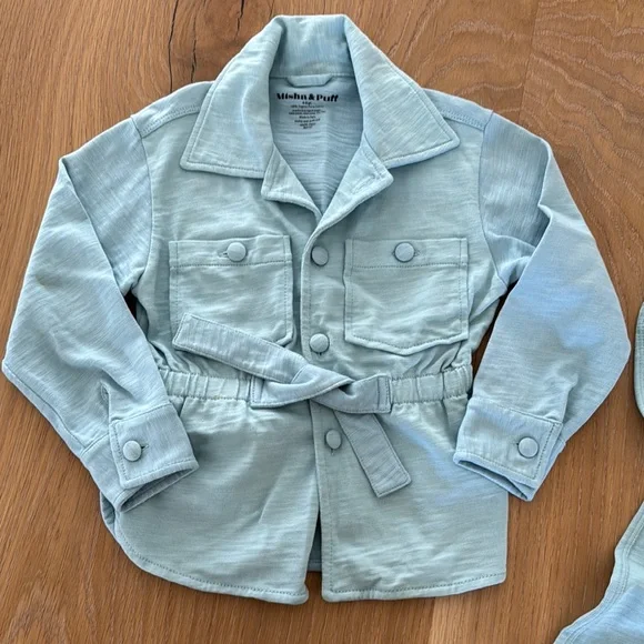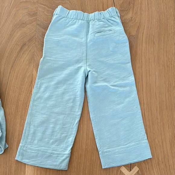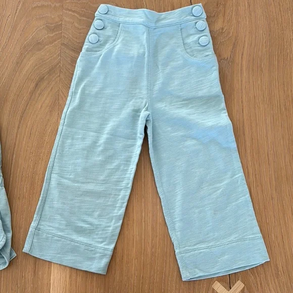 Stylish light blue jacket and pants set. Directors Jacket. sailor pants. Elastic waist. Pants are like new. EUCJacket is also EUC apart from a few tiny marks form an art project (pictured) which may come out in wash. Incredible quality items and a lovely special occasion look! :)I always buy tops/outerwear in a size larger than the pants, since I won’t want the pants to drag and I like a little wiggle room in the jacket for layers. Both fit great around age 4, and up to 5!