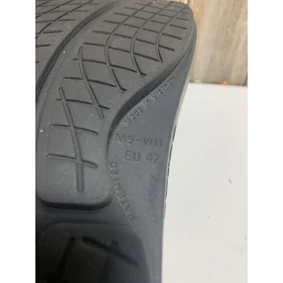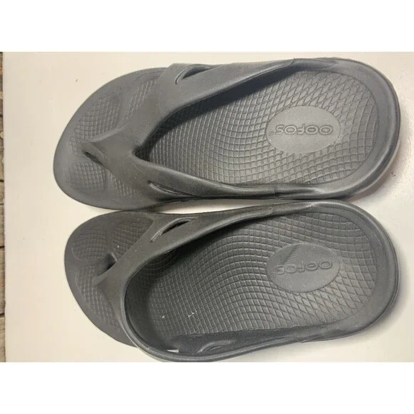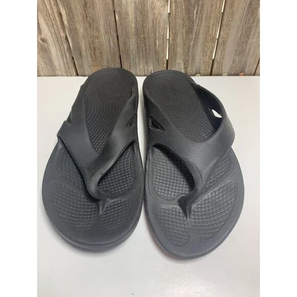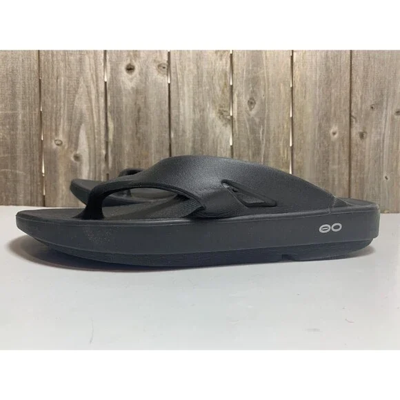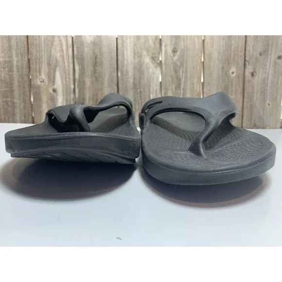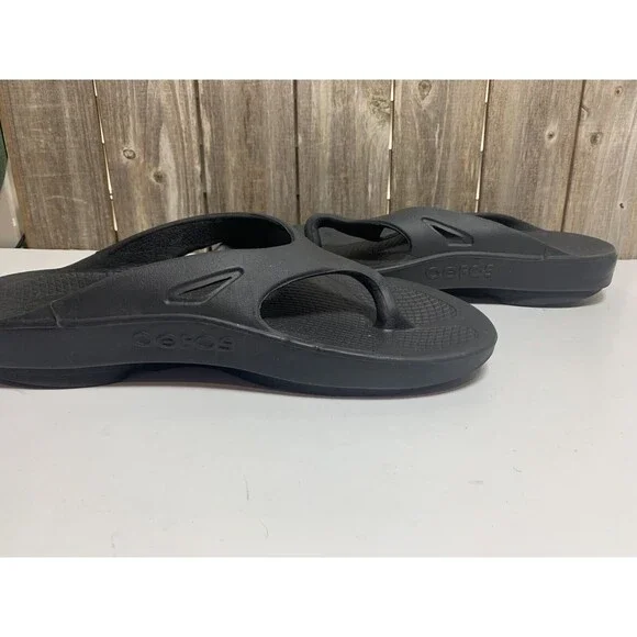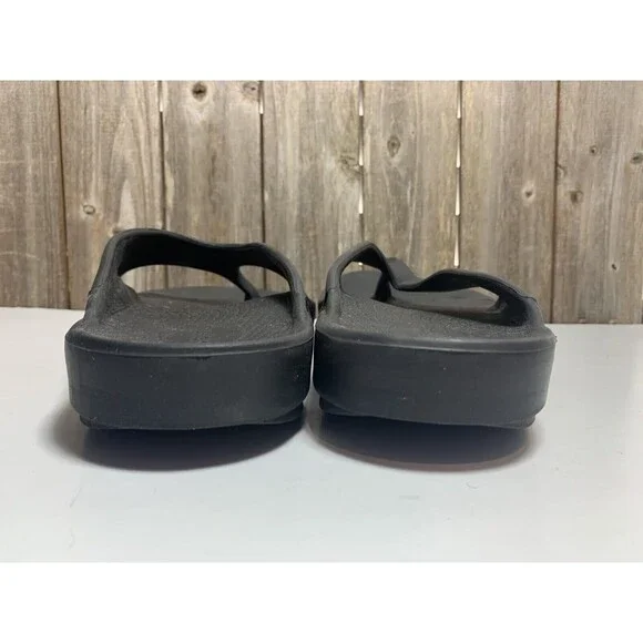 Gently used. In good used condition. Slight deformation from other shoes sitting on top of them. Foam molds back when in use as normal. Light dirt markings on soles and uppers from use. No box. I carefully package and ship ASAP. Reach out with any questions!This is a pair of Oofos OOriginal slide sandals in black, designed for both men and women. They are a size 9 for men and size 11 for women, with a UK size of 8 and EU size of 42. The sandals feature orthotic recovery technology to reduce stress, have a flip flop style, and are made of synthetic material.