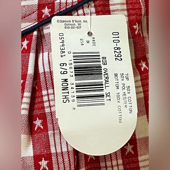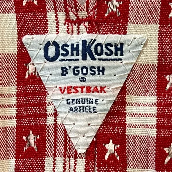 This rare vintage Oshkosh B’Gosh red gingham stars deadstock set includes a collared polo shirt and overalls, perfect for a party or casual occasion. Made of 100% cotton, the short-sleeve shirt features button accents and snaps, while the overalls have patch details. With a size of 6-9 months, this two-piece set is machine washable and embodies a stars theme, ideal for summer, fall, and spring seasons. Made in the United States, this unisex baby and toddler outfit is ideal party attire. New with tags condition with no noted flaws. Super rare set!(834)