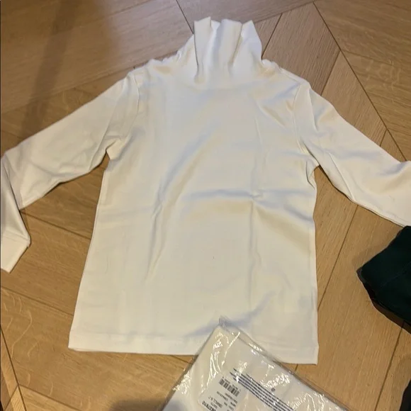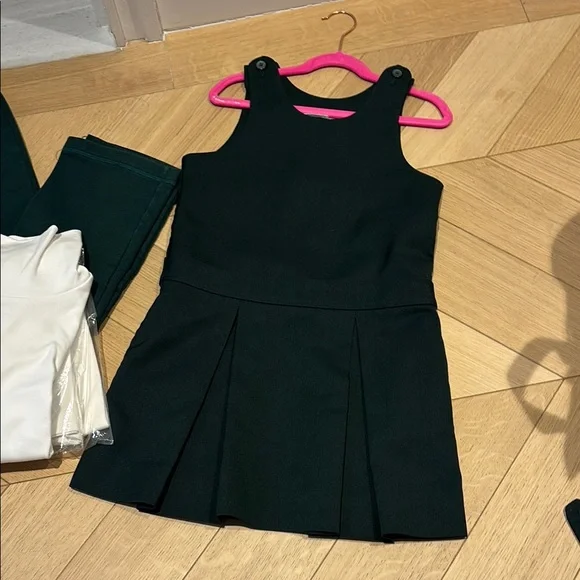 Stylish kids´ clothing set in dark green and white. Includes pants and a dress.Uniform bundle Sweatpants size S (6-7) 2 items in good condition/ pre loved Jogger sweatpants size S (6-7) 1 item in good condition/ pre loved Green jumper mills uniform size S / pockets/ adjust length / good condition -3 items White turtleneck size S 3 items all NEW lands end Cable socks 2 pairs pre loved See photos for any imperfections Pet and some free home