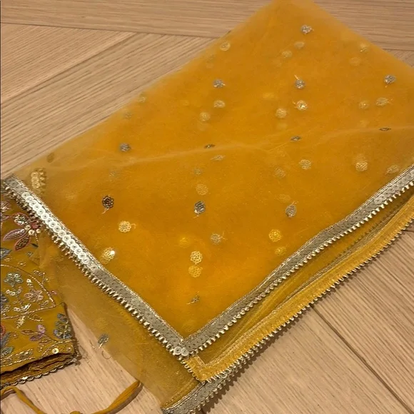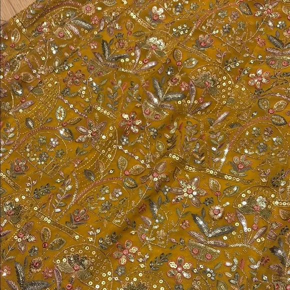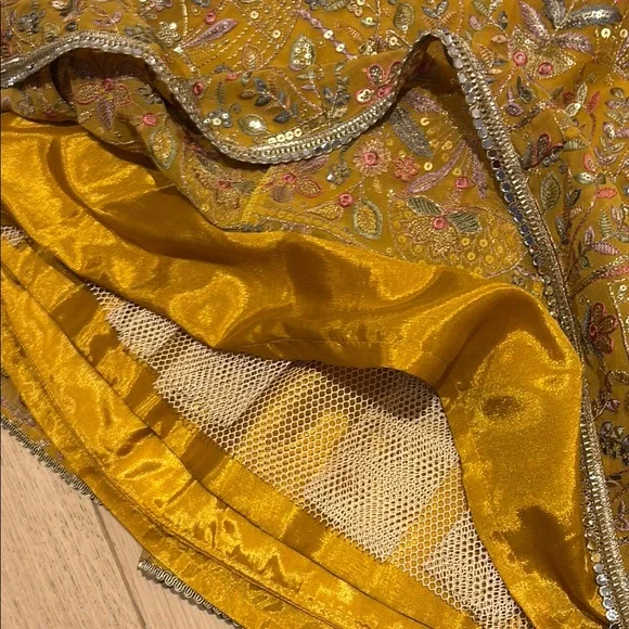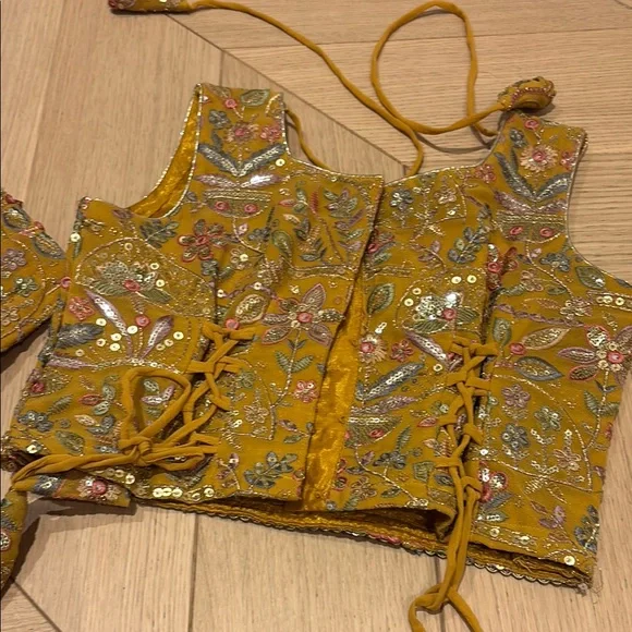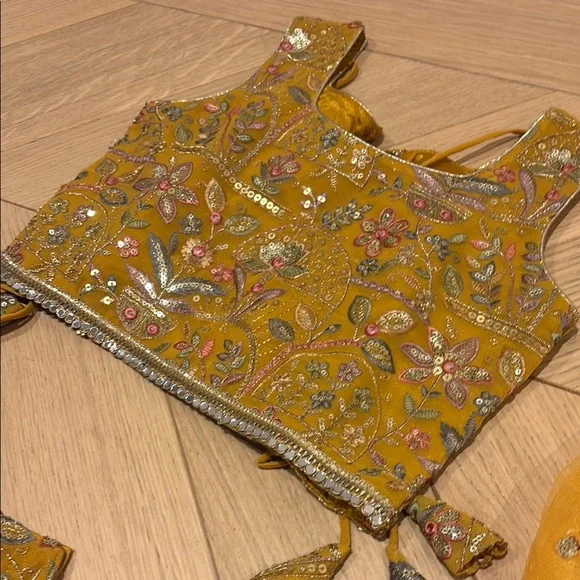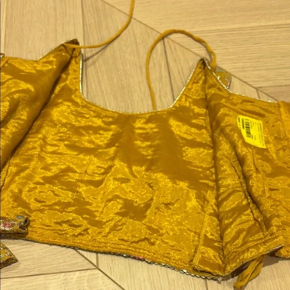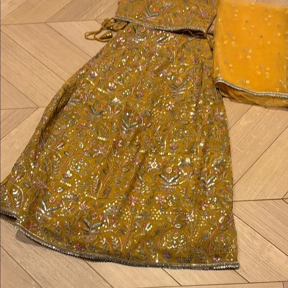 This enchanting kids lehanga features a dazzling gold design, perfect for any special occasion. The shimmering details add a touch of magic, making it a delightful choice for your child´s dress-up collection.New Back hooks adjustable ribbons Bottoms hook and zipper Lehanga choli Pet and some free homeMy little is 8 and can fit in this outfit