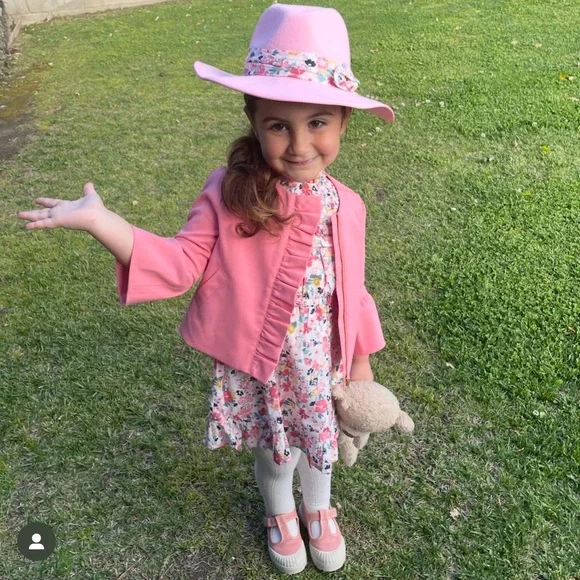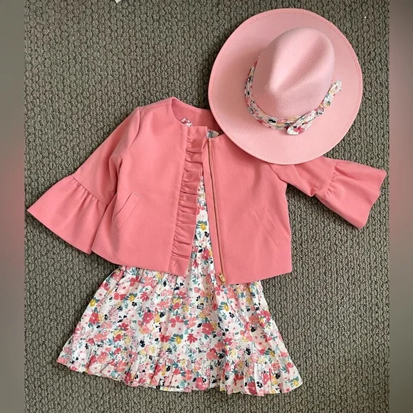All pieces worn only once- in great condition!!Felt hat- 2-3yr $35Floral ruffle dress- 3T $64Bell Sleeve Ruffle Jacket- 3T $72