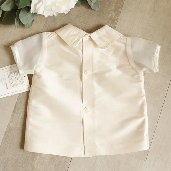 This Baby Boy´s Silk Outfit is Gorgeous!!The set is done by Will´Beth, a high-end Boutique brand.Done in a stunning cream 100% Silk.The point collar is trimmed in an...